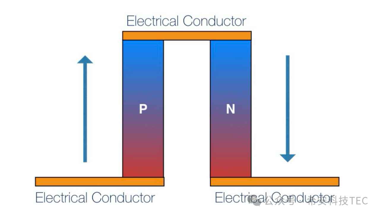 जब सीधा विद्युत् थर्मोकोपलबाट जान्छ, पी-टाइप र एन-टाइप सेमीकन्डक्टर ग्रेनहरू (पी-टाइप (बोरन जस्ता त्रिवैलेन्ट तत्वहरूसँग डोप गरिएको, जसमा प्वालहरू छन्) प्वालहरू मार्फत बिजुली सञ्चालन गर्छन् र सकारात्मक रूपमा चार्ज हुन्छन्; एन-टाइपको एक जोडी (फस्फोरस जस्ता पेन्टाभ्यालेन्ट तत्वहरूसँग डोप गरिएको) जसले इलेक्ट्रोनद्वारा विद्युतीय चार्ज गर्दछ।
