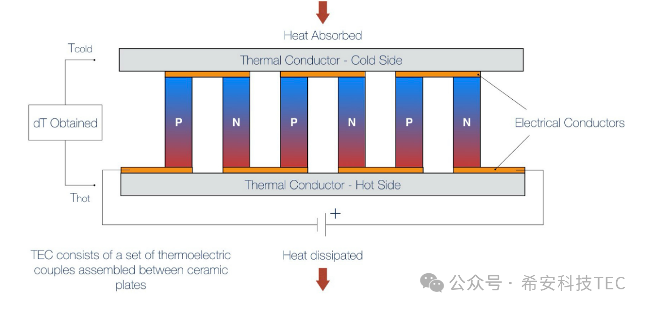 थर्मल कन्डक्टरहरू थर्मोकोपलको दुबै छेउमा थपिएका छन् जुन निम्न चित्रमा देखाइएको छ: पूर्ण TEC बनाइएको छ। जब TEC संचालित हुन्छ, माथिल्लो सतहले गर्मी अवशोषित गर्नेछ, जसलाई चिसो अन्त भनिन्छ, र अवशोषित गर्मी Q0 हो। The lower surface releases heat and is called the hot surface, with the heat released being Q1 ; Q1= Q0+Qtec